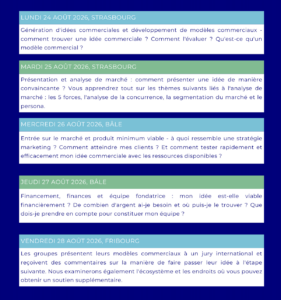 Ouvert aux étudiants de la région du Rhin supérieur et ailleurs, le programme réunit des participants de l’Université de Strasbourg, de l’Université de Fribourg-en-Brisgau et de la Haute école spécialisée du Nord-Ouest de la Suisse. À travers des conférences interactives animées par des professeurs et des entrepreneurs, ainsi qu’un travail interdisciplinaire en équipe, les étudiants appliquent directement les outils à de véritables idées d’entreprise.